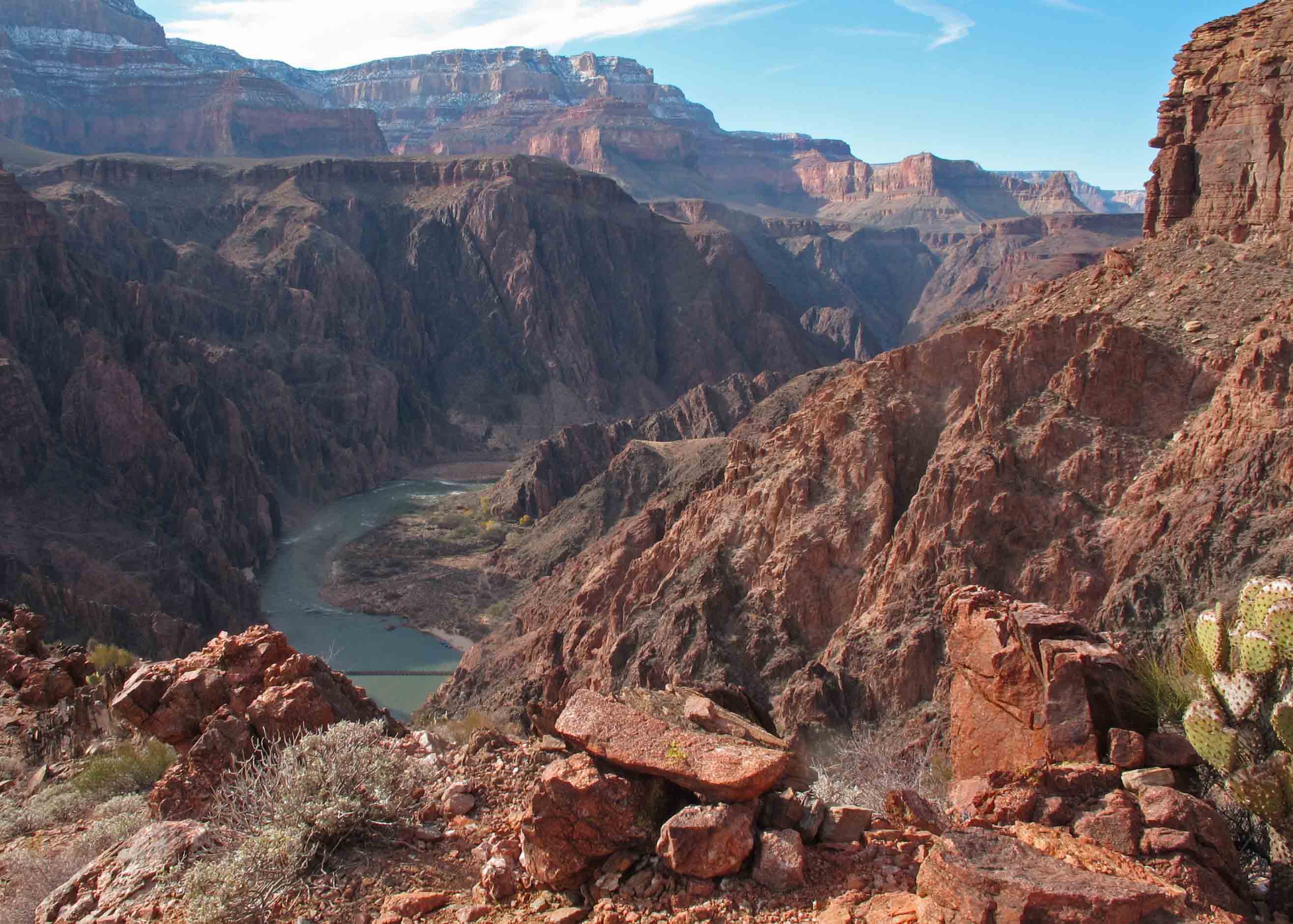 Too much weight could be a trip-ender while attempting to hike up the nearly 5,000-foot elevation gain from river to rim, the equivalent of climbing more than 500 office building floors while covering miles of uneven terrain and ever-changing conditions in winter. As Bob said, “There’s no such thing as bad weather… just the wrong clothes. Pack wisely.” A small percentage of the nearly five million visitors who see the Grand Canyon each year hike below the rim and several hundred of those are rescued inside the canyon. Lack of preparation is commonly cited in trips that end badly.