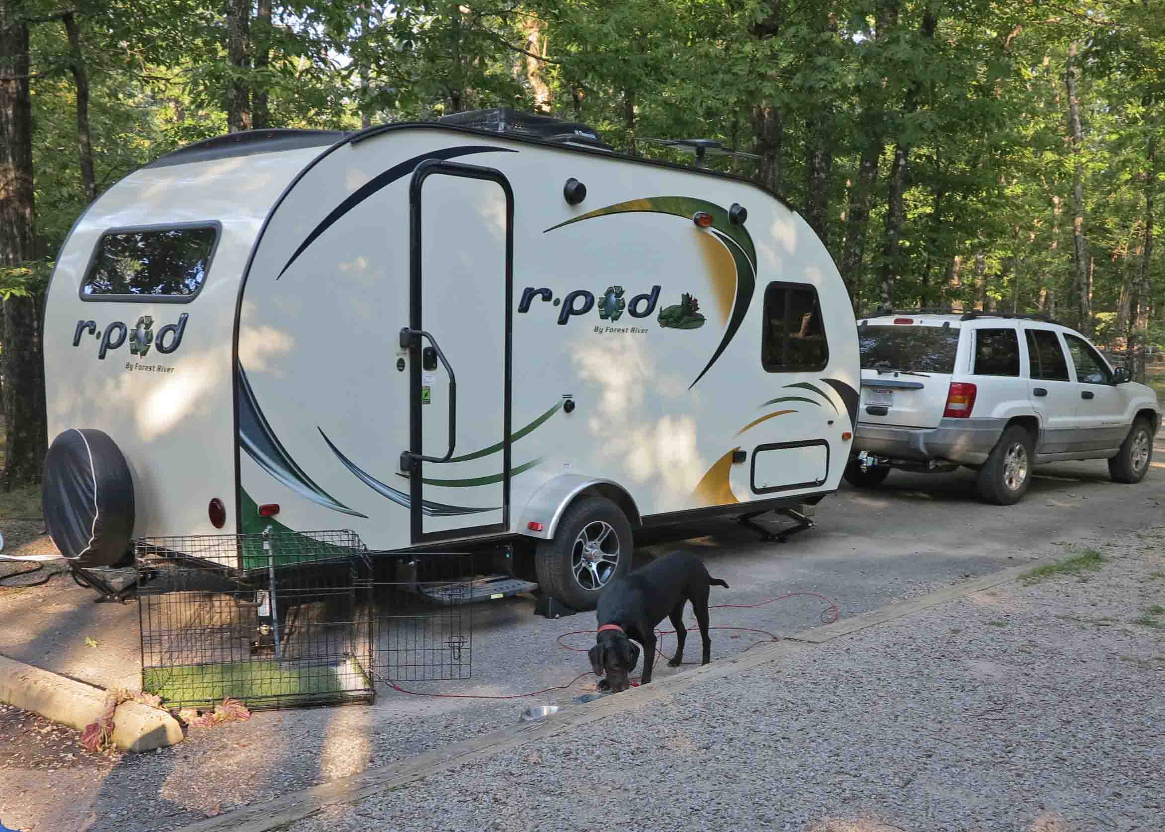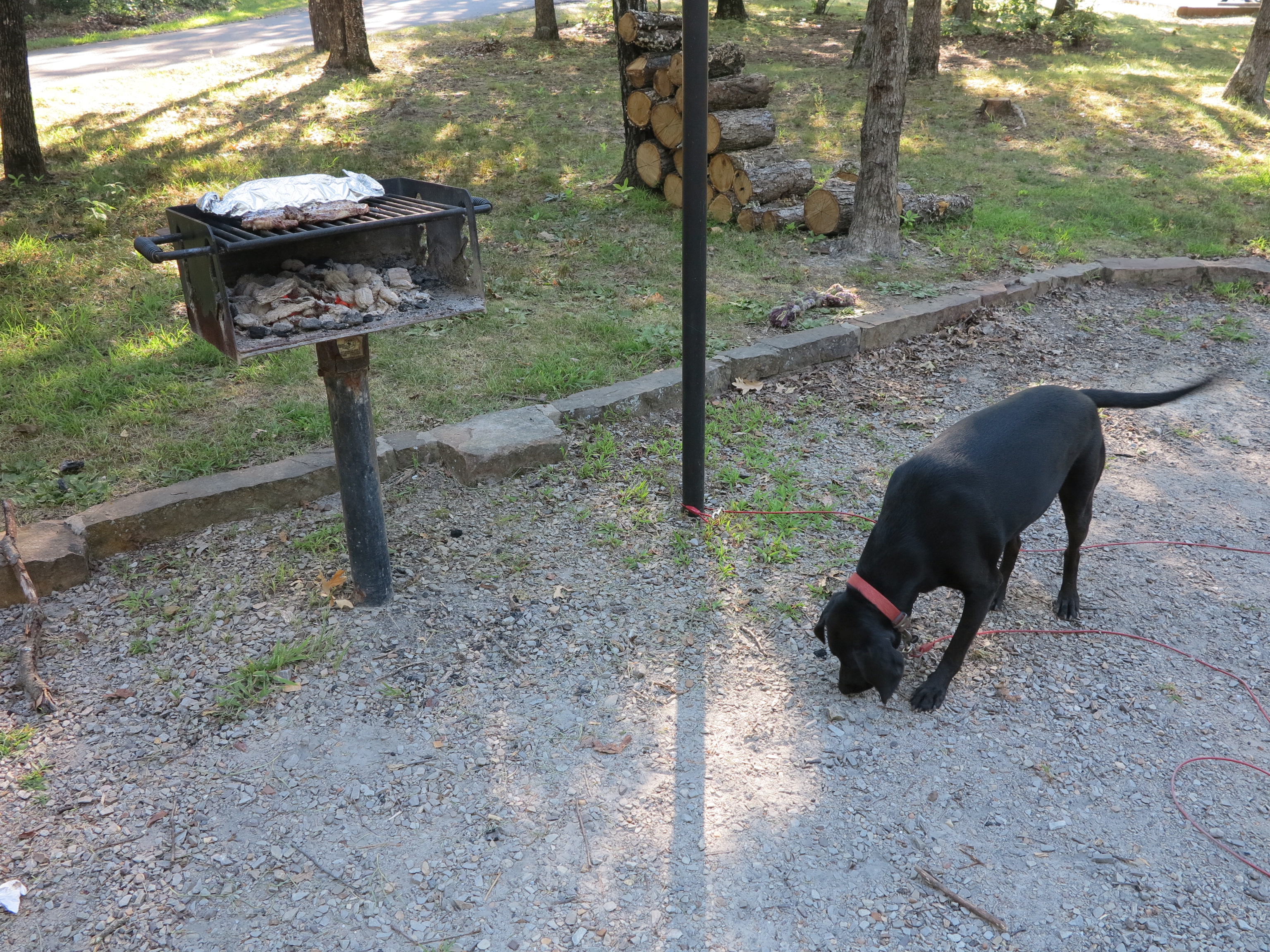 Temperatures were so mild that we didn’t use the air conditioner on our second night on the mountain. I must brag on Hiker-dog. She sleeps in a wire crate next to our trailer and doesn’t bark or disturb fellow campers through the night.