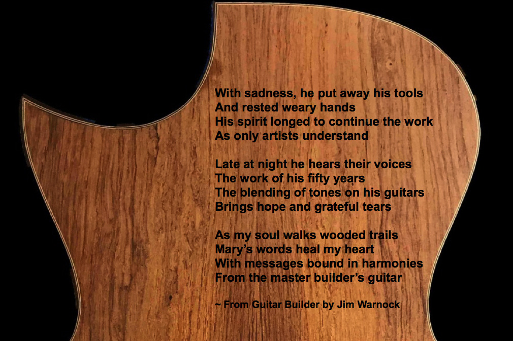 I look forward to Clayton Pledger’s next steps as this guitar takes shape. Below is part of a poem I wrote while thinking about how difficult it must be for John Greven to stop doing this work he loved for so many years. I’m thankful that he was a good teacher and that I’m getting to work with one of his excellent students.