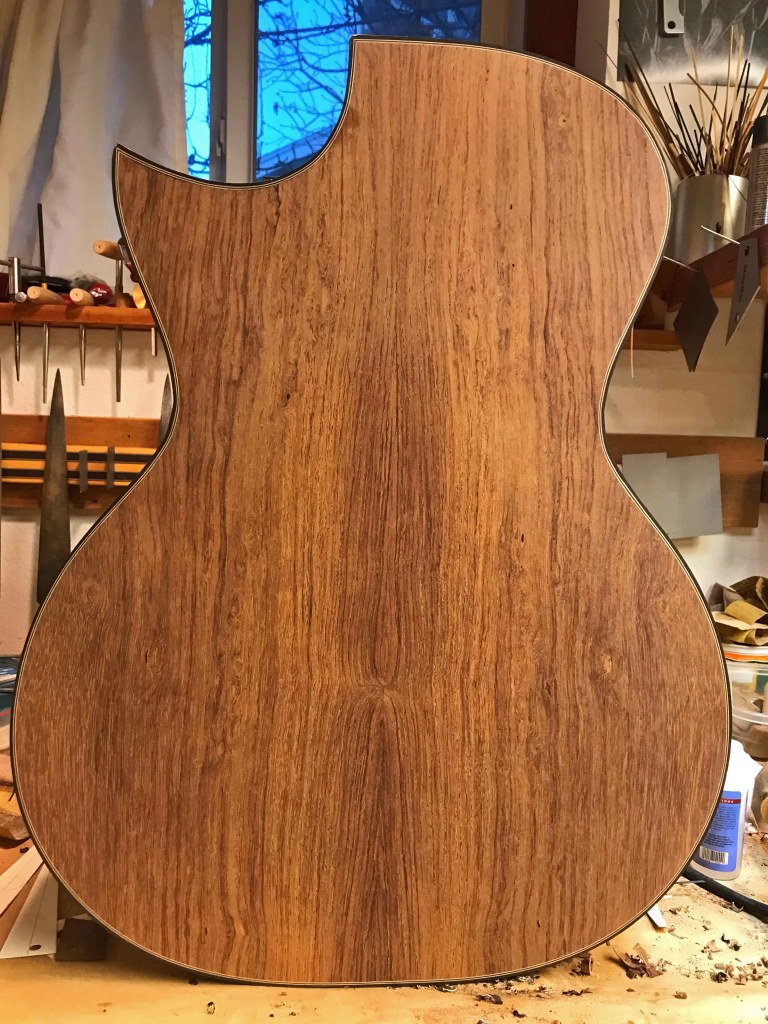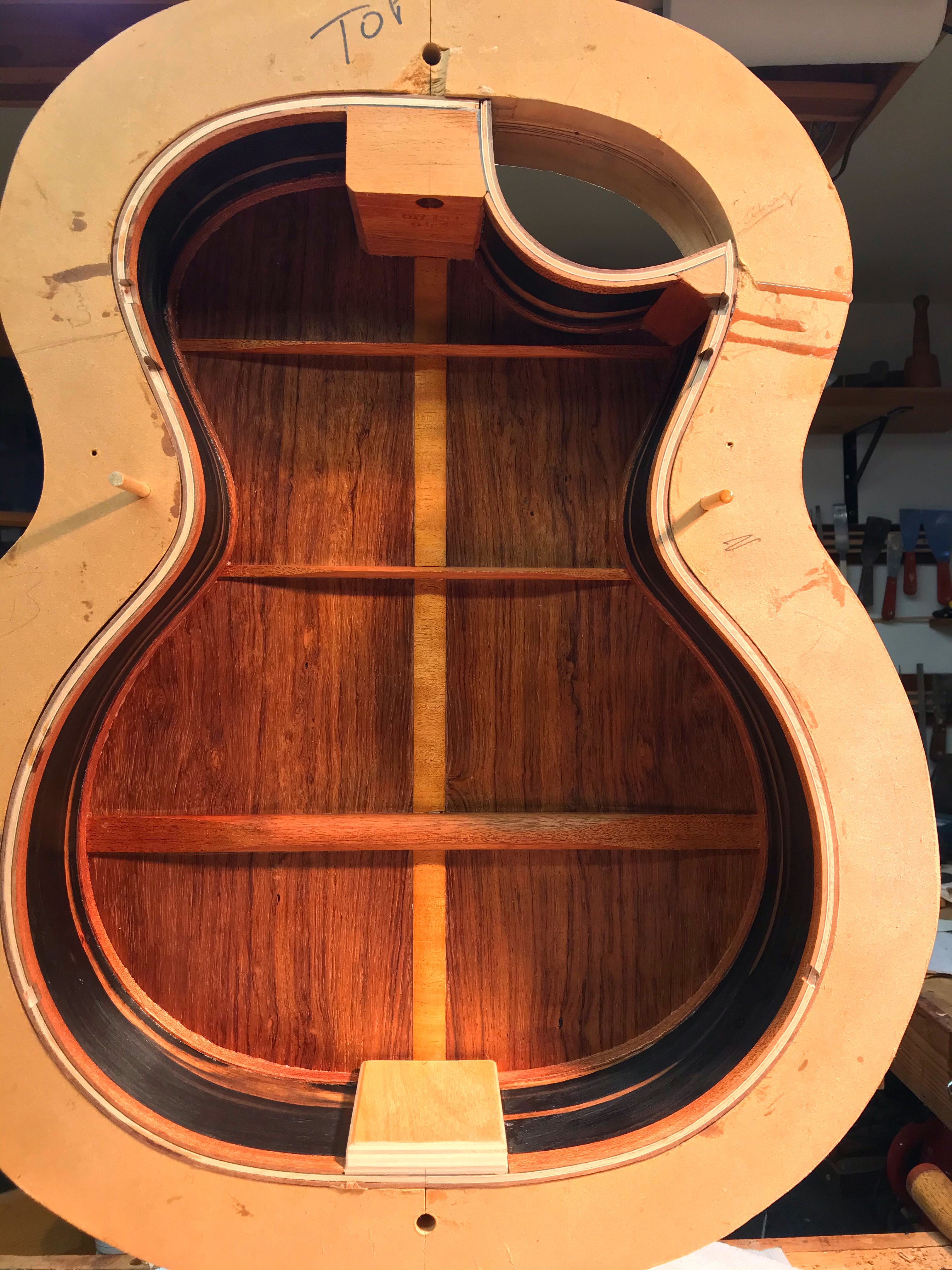 A few days later, scalloped Sitka Spruce bracing was in place and the top and back were firmly bound to the rosewood sides. I was pleased with the subtle ebony binding along the edges.