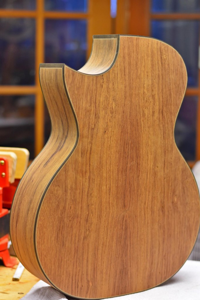Several large companies and shops build excellent guitars, but I determined that Pledger Guitars were excellent and competitively priced. Having a personal connection with the builder was important to me for this instrument. Clayton had just begun working on a cutaway OM-13 (Orchestra Model) with the qualities I wanted. Since an OM-13 connects the body with the neck at the 13th fret, I decided a cutaway would be best for reaching the upper range. My guitar teacher, Randy Soller, has been helping me learn to play up the neck as opposed to only using a few chords at the low end.