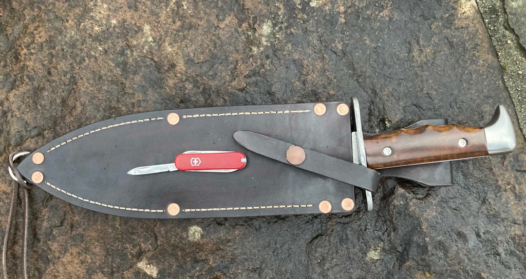 I originally thought I might use this knife for trail maintenance. Clearing brush was one of its uses in the military and its quarter inch thick blade makes this a good application. Once I saw Steve’s work, I knew it would probably not be carried in the woods. I’ll keep it nice and dry as something to be passed down in the family.