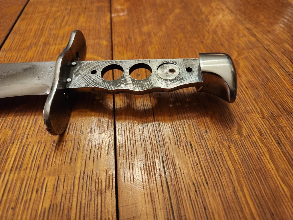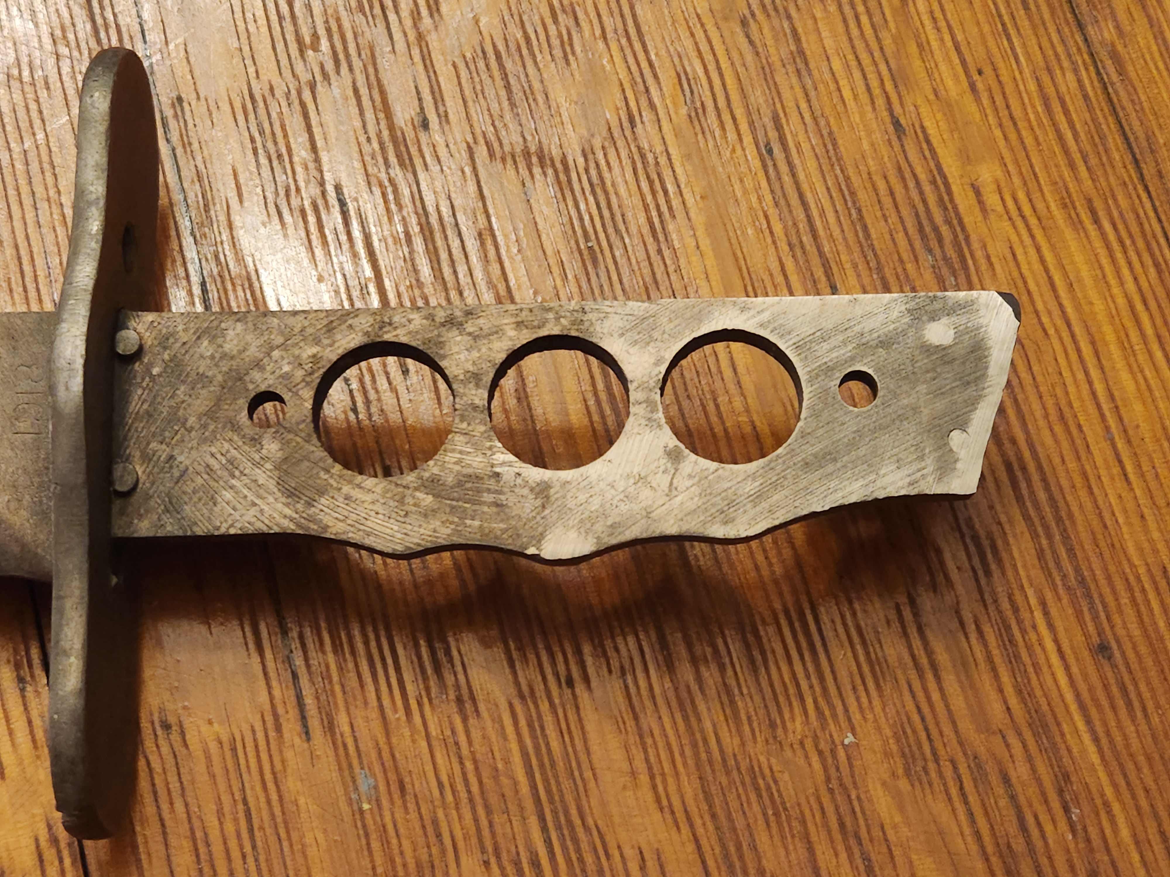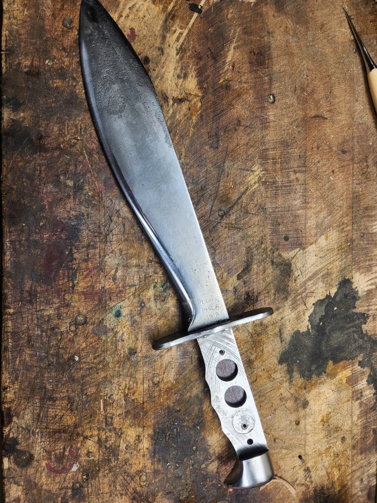 I found this model 1917 bolo knife in the bottom of my father’s toolbox. It was manufactured in 1918 in Philadelphia, PA. The before picture shows the knife as it was when I found it. The rough-hewn wooden handle made me think of my grandfather, but I can’t be sure of how it came down through the family. It’s my understanding that my grandfather, Arch Warnock, was in the Army at some point. Another possibility is that my father found it abandoned in an old apartment house he once owned.