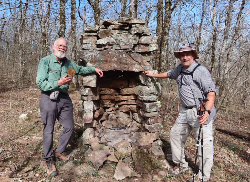 We were pleased to find an old chimney still in place along with a few rusty artifacts. I had a close look at the blade of what looked like a small hoe before returning it to where I found it. Bob found what looked like pieces of a horse or mule shoe. All items were left as we found them.