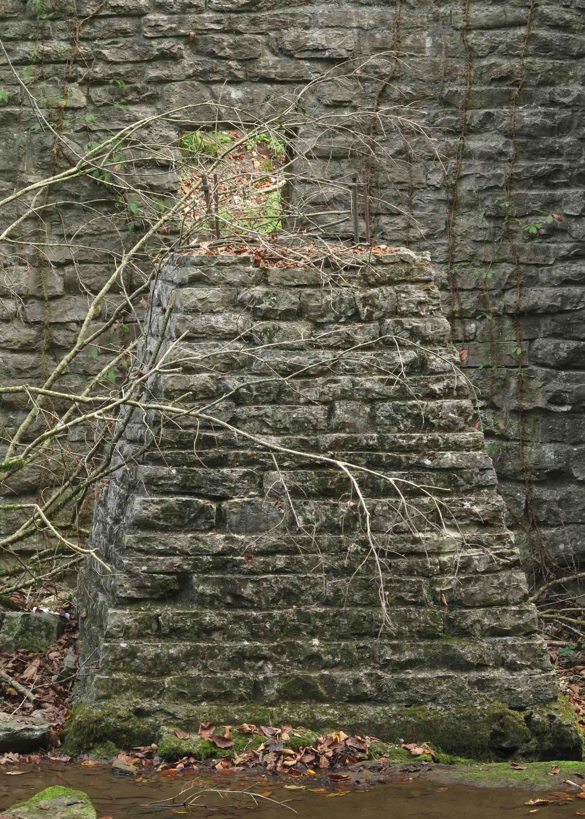This is the pedestal on which a waterwheel once turned. John Blanchard built this undershot grist mill in the 1880s. It sits downstream from Mirror Lake Dam as testimony to the hard working people who once made their lives in the Ozarks. The CCC restored the dam and part of the mill during the 1940s.