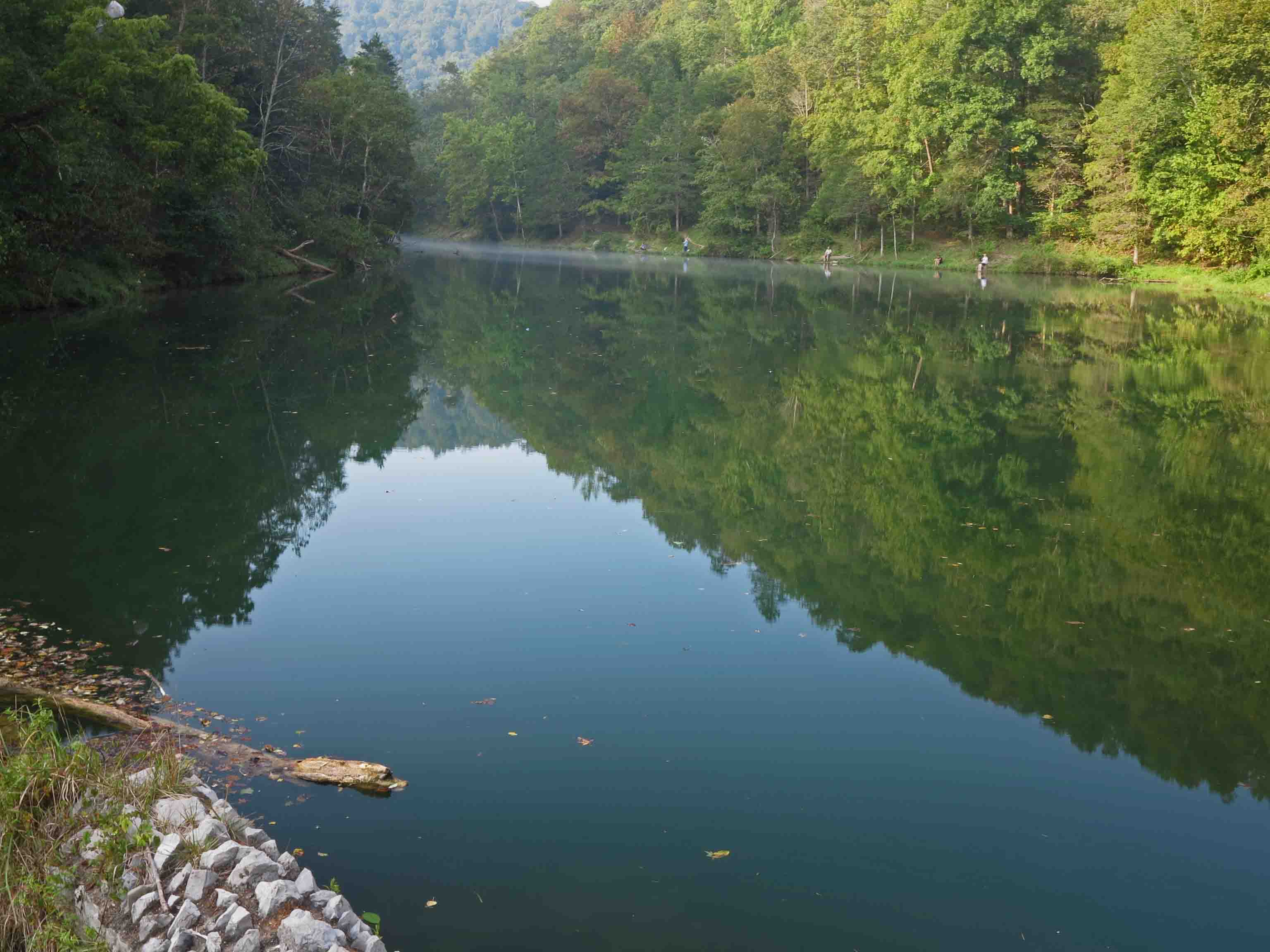 Blanchard Springs eventually flows into Mirror Lake, a green on green scene.