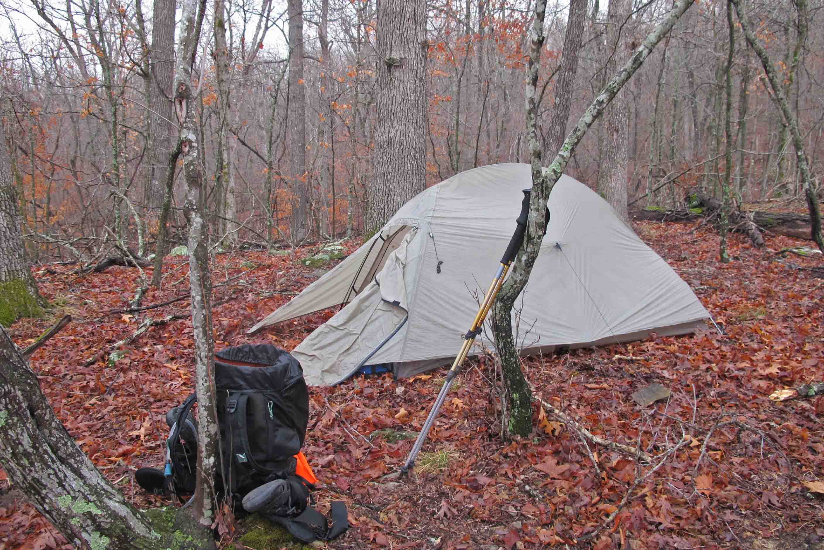 Enjoyed some reading as the sun slowly descended, revealing a bright moon and stars. This was a no-rain-fly night for sure. As I woke the next morning I felt a light mist of icy crystals. A fog had enveloped the ridge. I hopped up and prepared my first cup of coffee. A freshly ground cup never tasted as good as that Taster’s Choice instant made with water from an Ozark stream! After oatmeal and another cup of coffee, we were back on the trail.