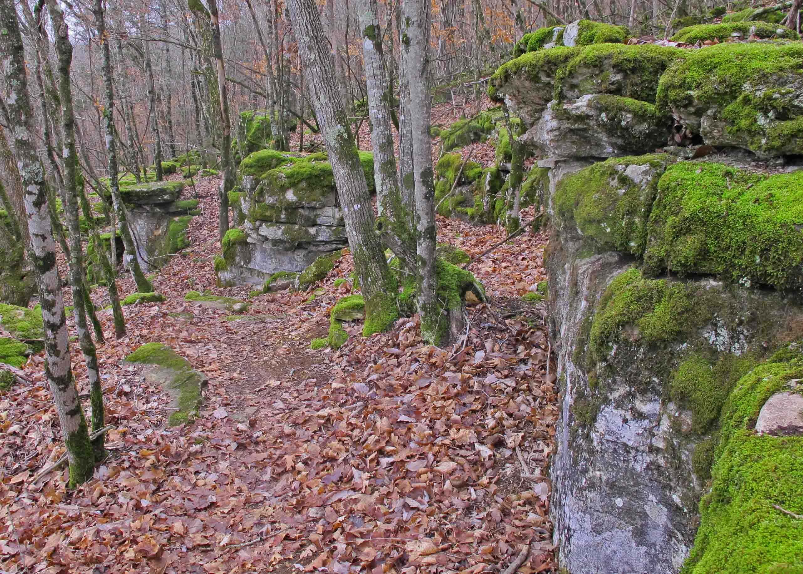 Moss-covered limestone maze similar to many that surround portions of the Buffalo River Trail.