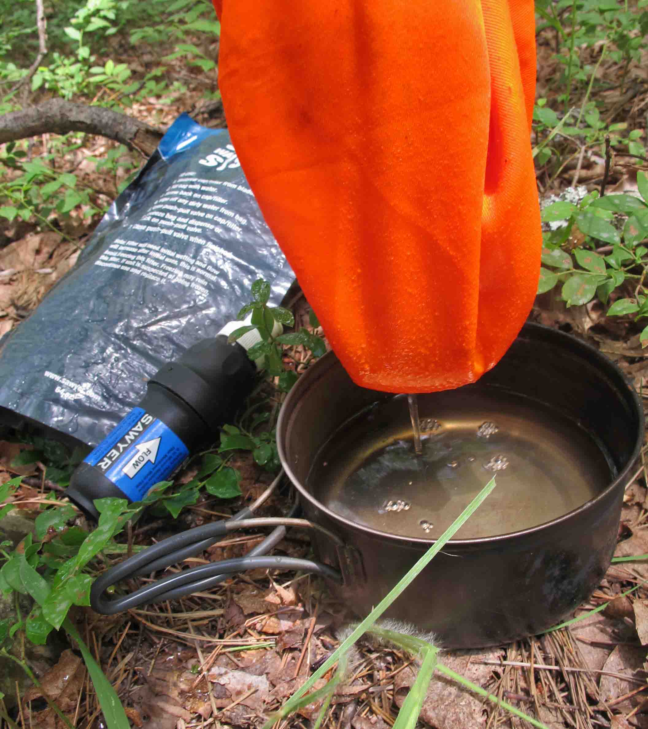 To be safe, I decided it would be necessary to filter some of this nasty stuff.  I used my bandana to filter the big stuff before using the Sawyer filter.  This worked well and the water was usable.