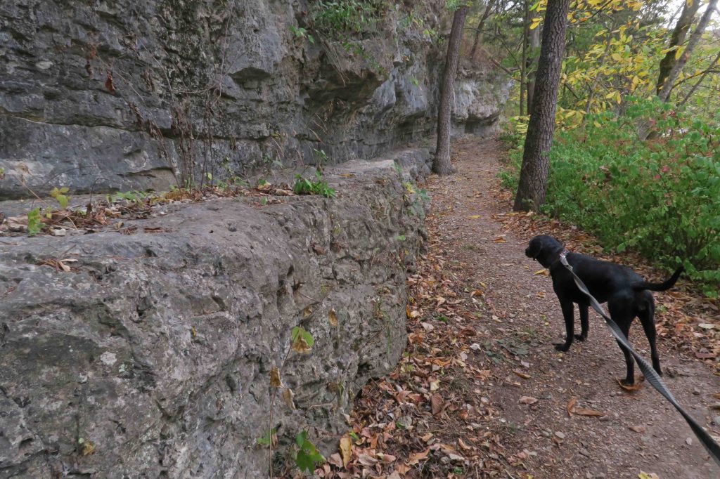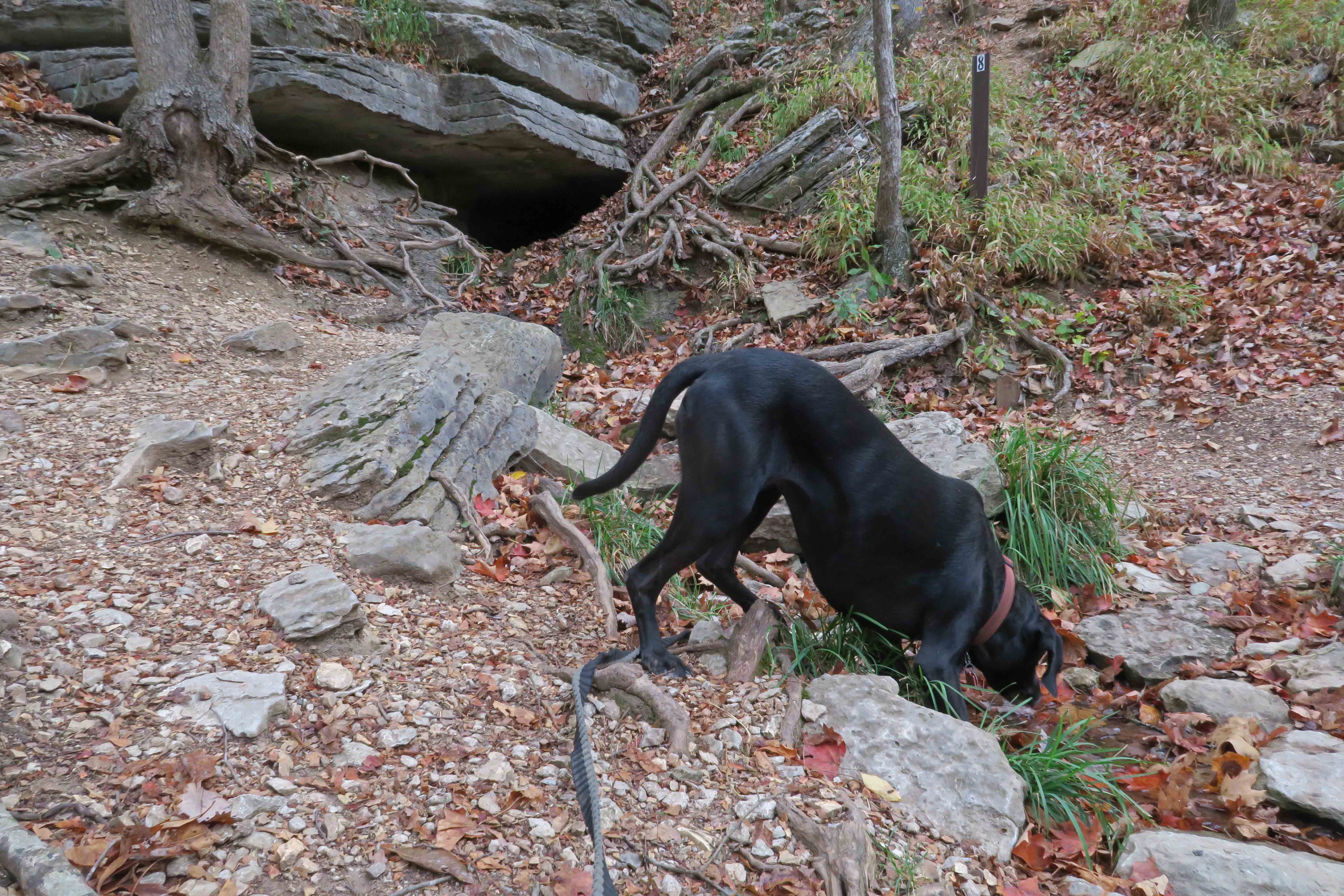 I poured out water for Hiker-dog on a couple of flat rocks as we walked. Though the trails surround Roaring River, drains were pretty dry. We were pleased to arrive at a small spring. The water seeps from under the rock ledge above and is crystal clear.