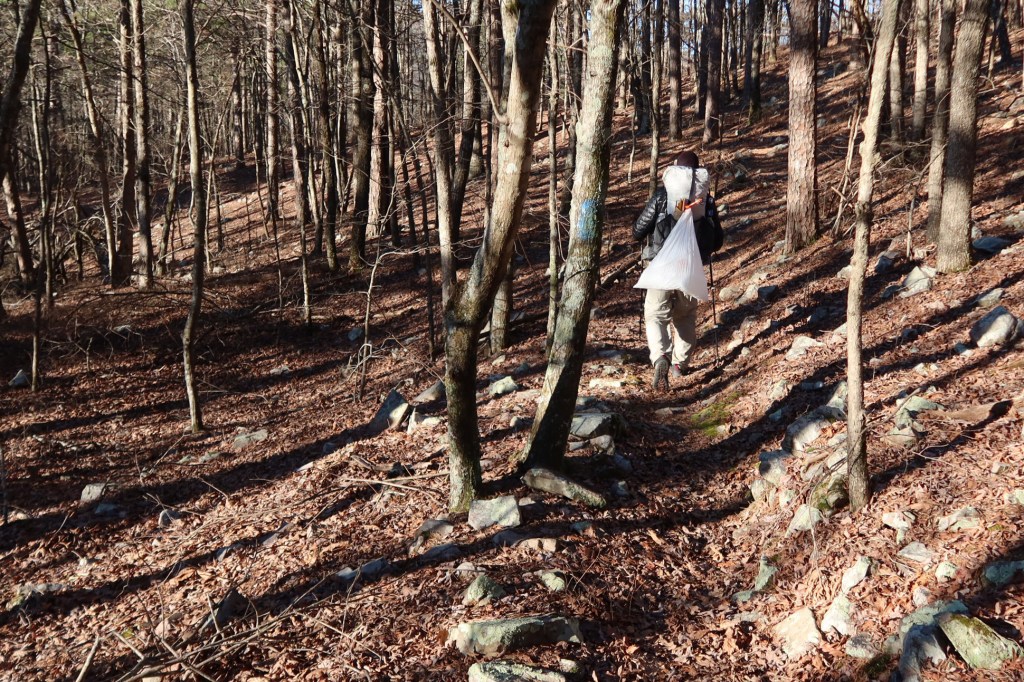 Thanks to occasional survey tape we were able to follow the trail without difficulty. Greenbriers clawed at us on the high ridges and we agreed this was a “long pants trail.”