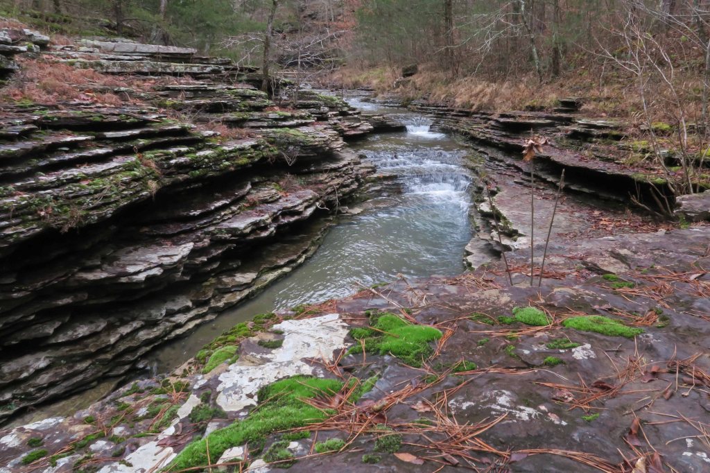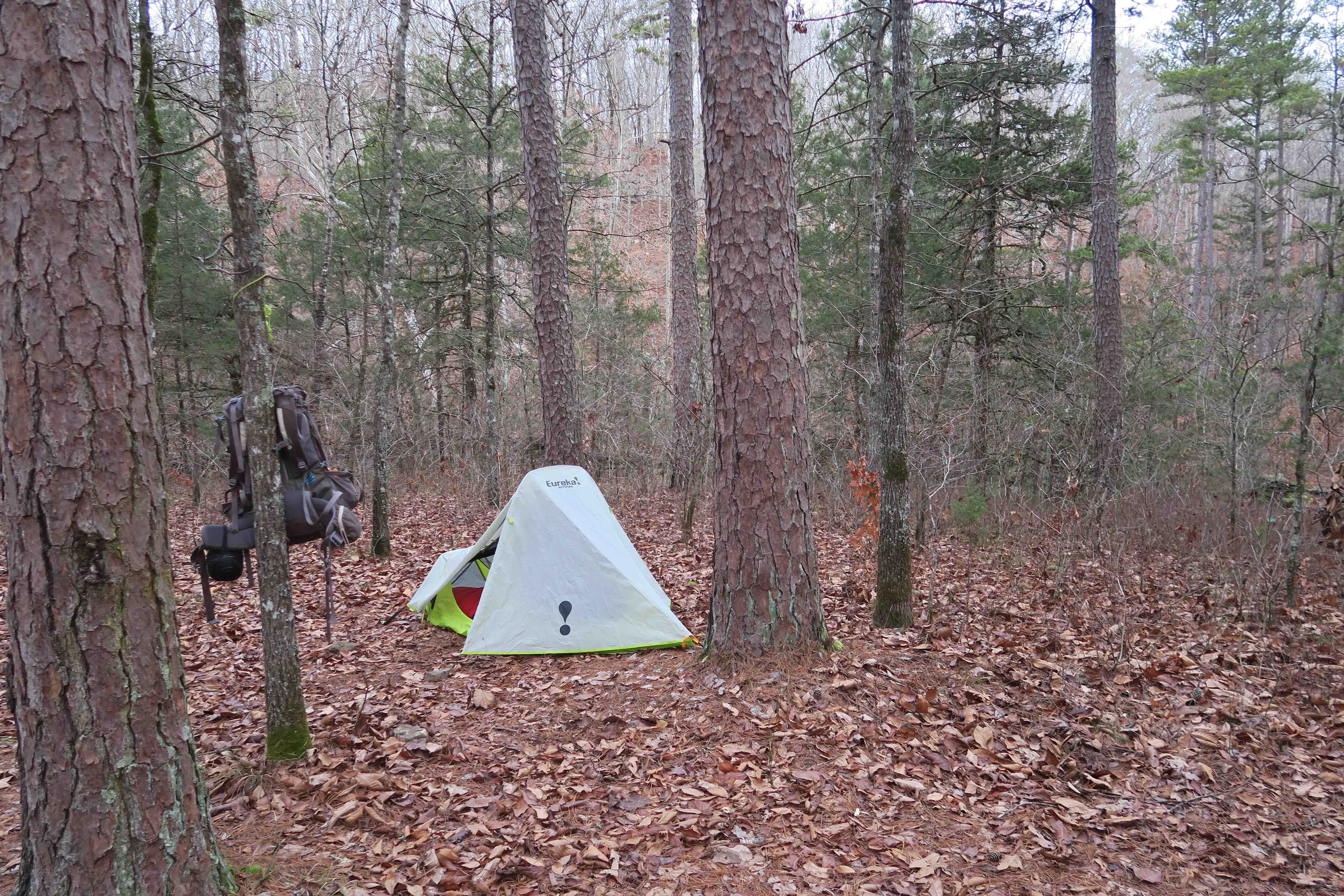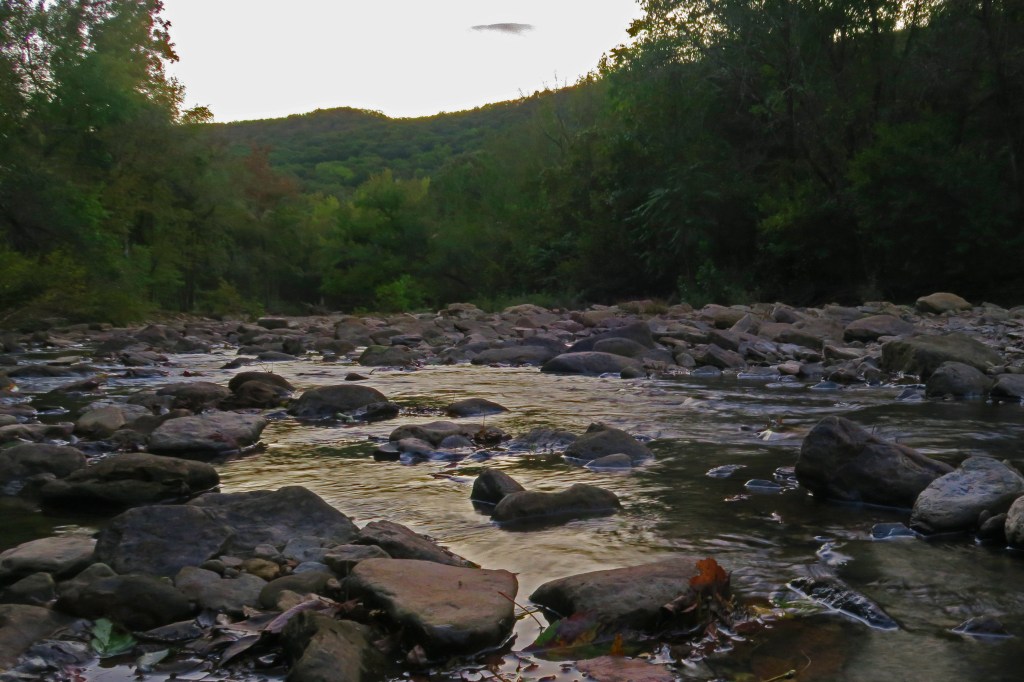 Late Friday night, Hiker-dog and I arrived at Wolf Pen Recreation Area on the Mulberry River. The whole place was ours on this cold night with drizzling rain. From the looks of it, the place probably gets heavy use when the river and weather are right for floating. I liked this location because it would put me driving past Oark General Store on the way to Arbaugh Trailhead the next morning.